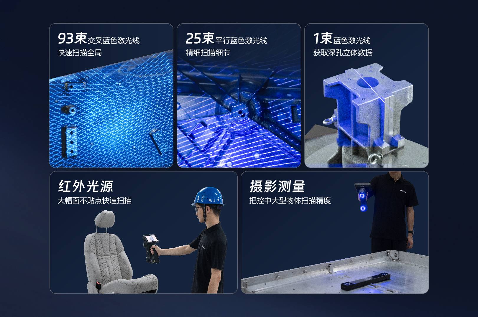 采用93束交叉蓝色激光线,速度可达835万点/秒,高效顺畅获取数据且实时生成网格。