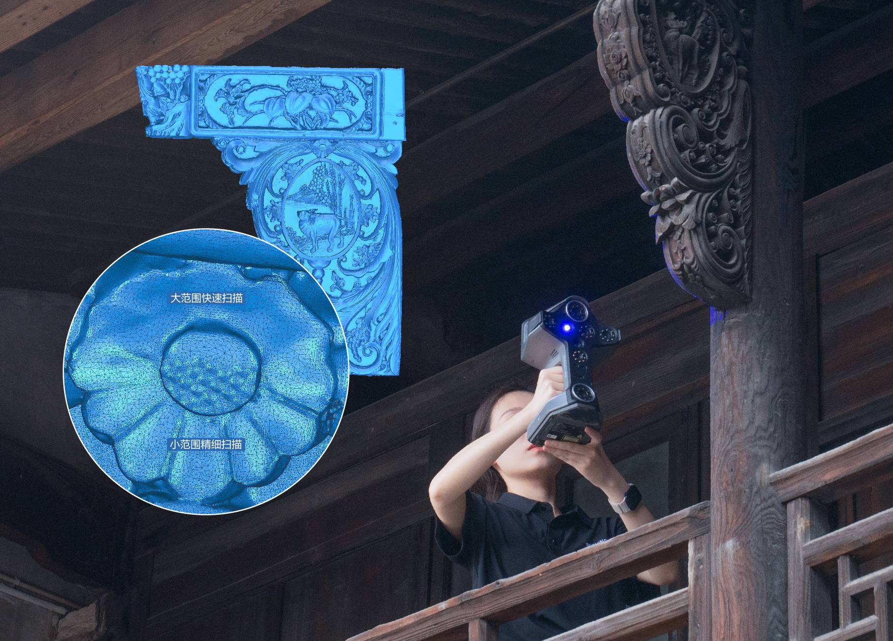 EinScan Libre创新采用三种光源,打造三大扫描模式:101束蓝色激光精细扫描细节、38束红外激光驾驭全景扫描、红外散斑大幅面不贴点快速扫描,同时支持多分辨率/多模式的融合拼接,兼具大场景高效扫描以及细节精细还原。