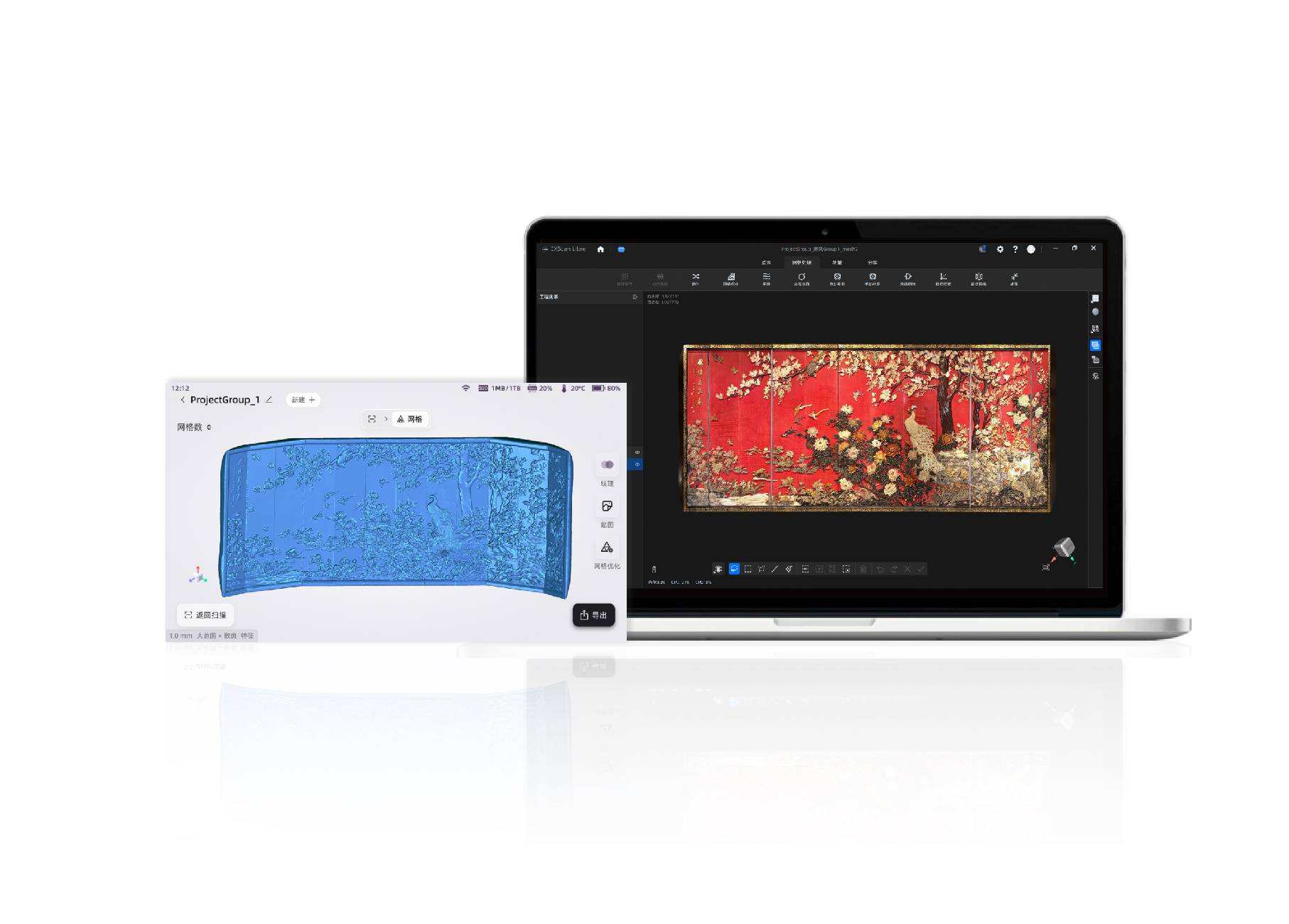 EinScan Libre配备了4800万像素的超高清彩色相机,精准还原物体表面的色彩细节。此外,Libre支持在小范围激光精细模式下,利用丰富的色彩信息来实现数据拼接,在细腻还原几何特征的同时,完美展现物体的真实色彩。